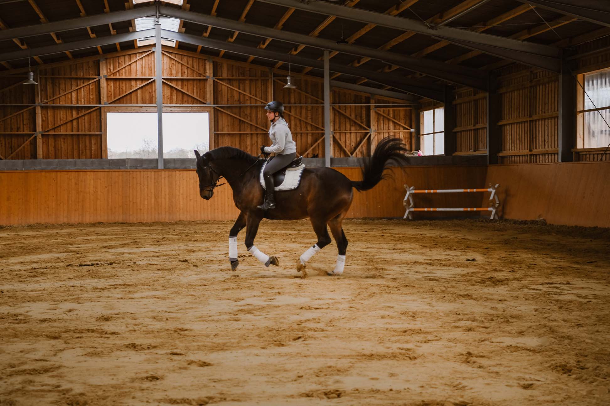Ein landschaftlich reizvolles Ausreidgelände im Naturschutzgebiet Haard, der Reitplatz und unsere Reithalle bieten verschiedene Möglichkeiten für das Training und die Bewegung der Tiere.